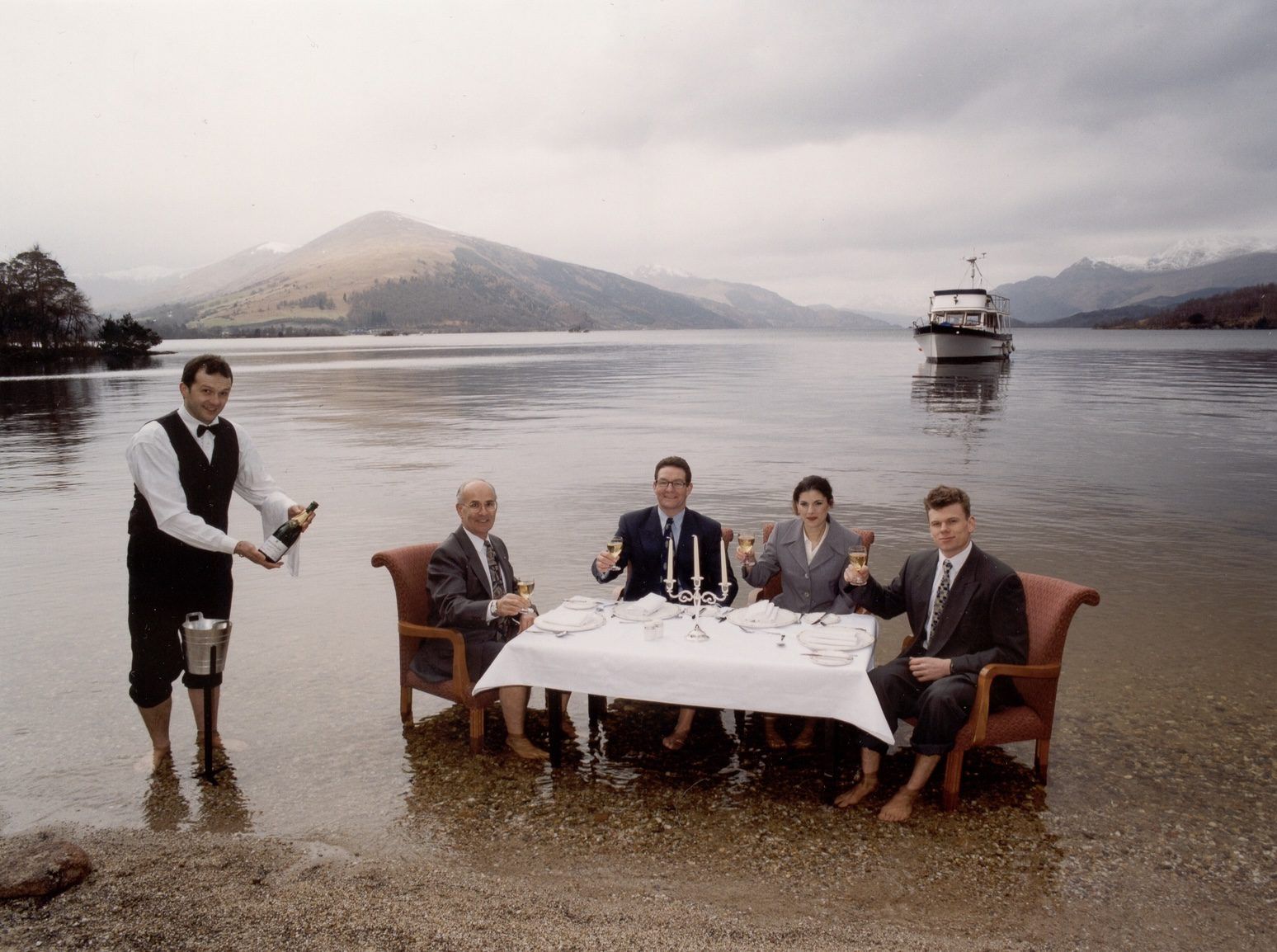 This alfresco lunch set up was our way of saying we can make anything happen and our first ever attempt at a promotional shoot, back in 1997! Being tough Scots, we figured that February was the best time of the year and that rolled up trousers and bare feet was better than wearing wellington boots! I was sitting up on the beach with my Creative Director’s hat on laughed until I ached as our willing models, including my father-in-law, who we were screaming and complaining at not being able to even feel their feet due to the cold!!