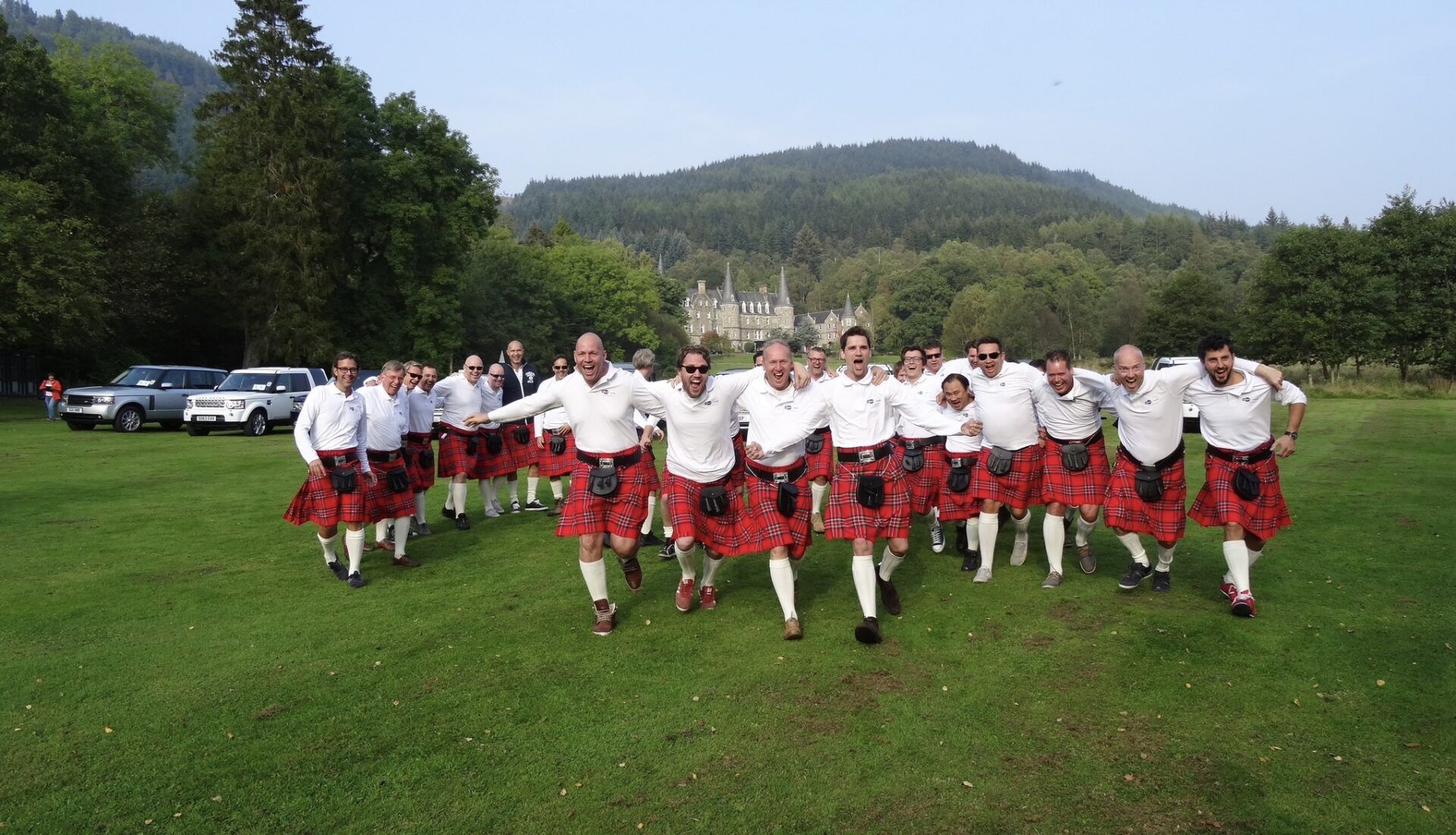 This kilted warrior charge, back in 2014, launched only 3 hours after these directors from the Dutch Telecoms industry arrived in Scotland! Leaving Edinburgh Airport in a fleet of self-drive Land Rovers, we headed for the highlands. Lunch was in a private house where they enjoyed local steak and fish which they cooked on hot plates before they found themselves naked in the garden getting dressed into kilts and a rugby shirt, complete with the company logos sewn in…I had written a clan chant for them whose words were all connected to their brand and goals as a company. This was handed to them before they left the lunch and when they met me 45 minutes later, they were ready to scream it out and without provocation they felt the need to charge… the warrior within was beginning to show face!!